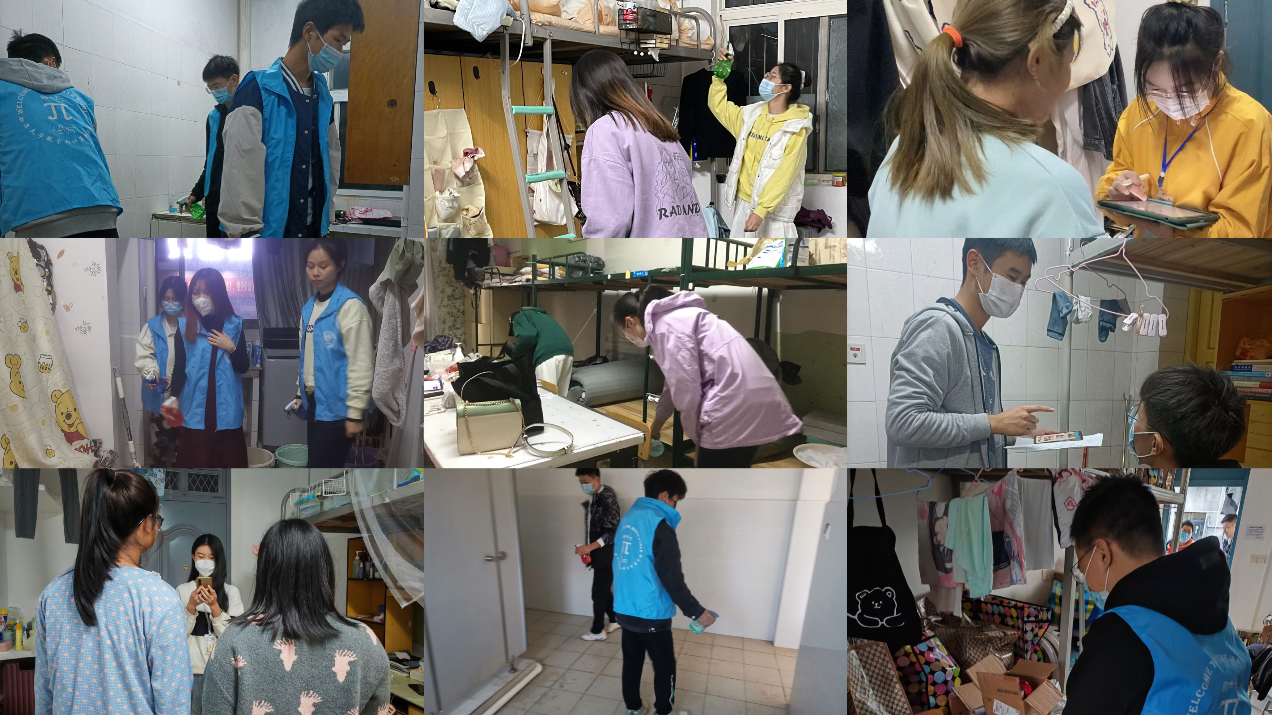 党员和志愿者深入学生宿舍,向同学们介绍当前市区疫情防控的严峻形势,宣讲我校当前疫情防控管理规定,携带八四消毒液、酒精等物品为学生寝室中的桌椅与地面消毒,并叮嘱同学们提高安全防护意识,出门戴好口罩,注意个人卫生等等。
