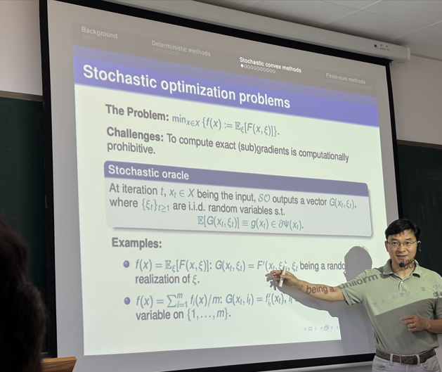 7月2日至5日,蓝教授主讲了以"First-order and Stochastic Optimization Methods"为主题的系列课程。课程内容分为三个循序渐进的模块:第一部分重点讲解确定性一阶方法及其在凸随机优化中的应用,涵盖随机梯度下降、镜像下降法、加速算法以及方差缩减技术等基础内容;第二部分深入探讨非凸优化问题,详细解析非凸一阶与零阶方法、加速技巧以及方差控制策略;第三部分则聚焦前沿的无参数方法研究,包括凸与非凸场景下的最优性理论以及投影梯度法的自适应条件调整技术。课程内容既注重理论基础,又强调实际应用,为师生们指明了相关领域的前沿研究方向。