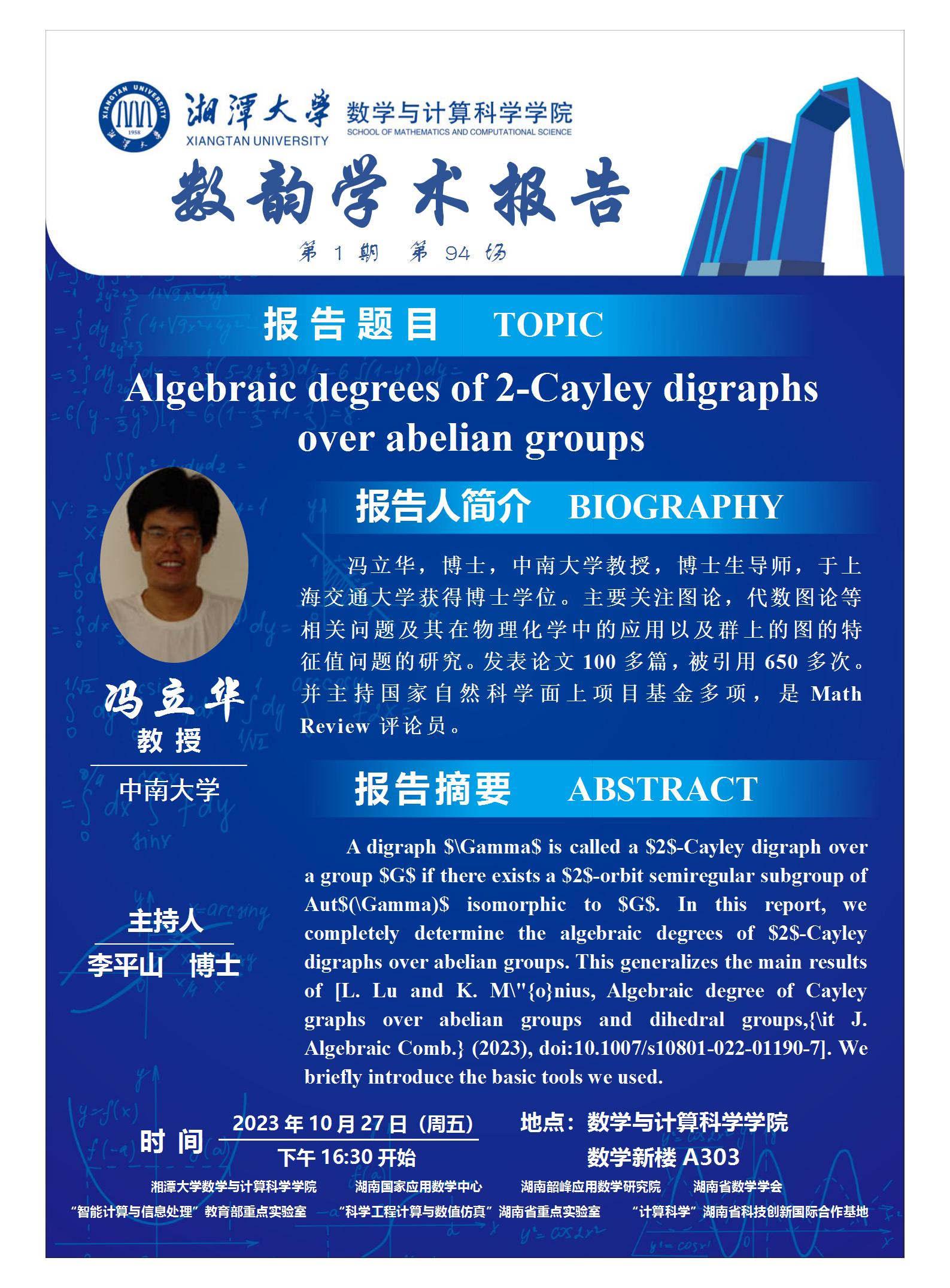 数韵学术报告-Algebraic degrees of 2-Cayley digraphs over abelian groups