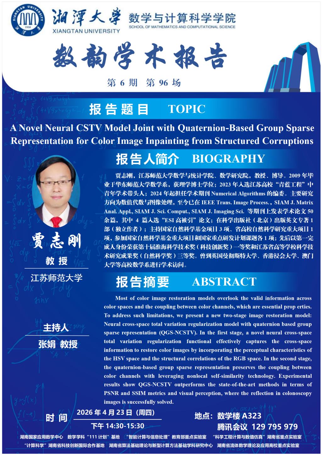数韵学术报告—贾志刚—A Novel Neural CSTV Model Joint with Quaternion-Based Group Sparse Representation for Color Image Inpainting from Structured Corruptions